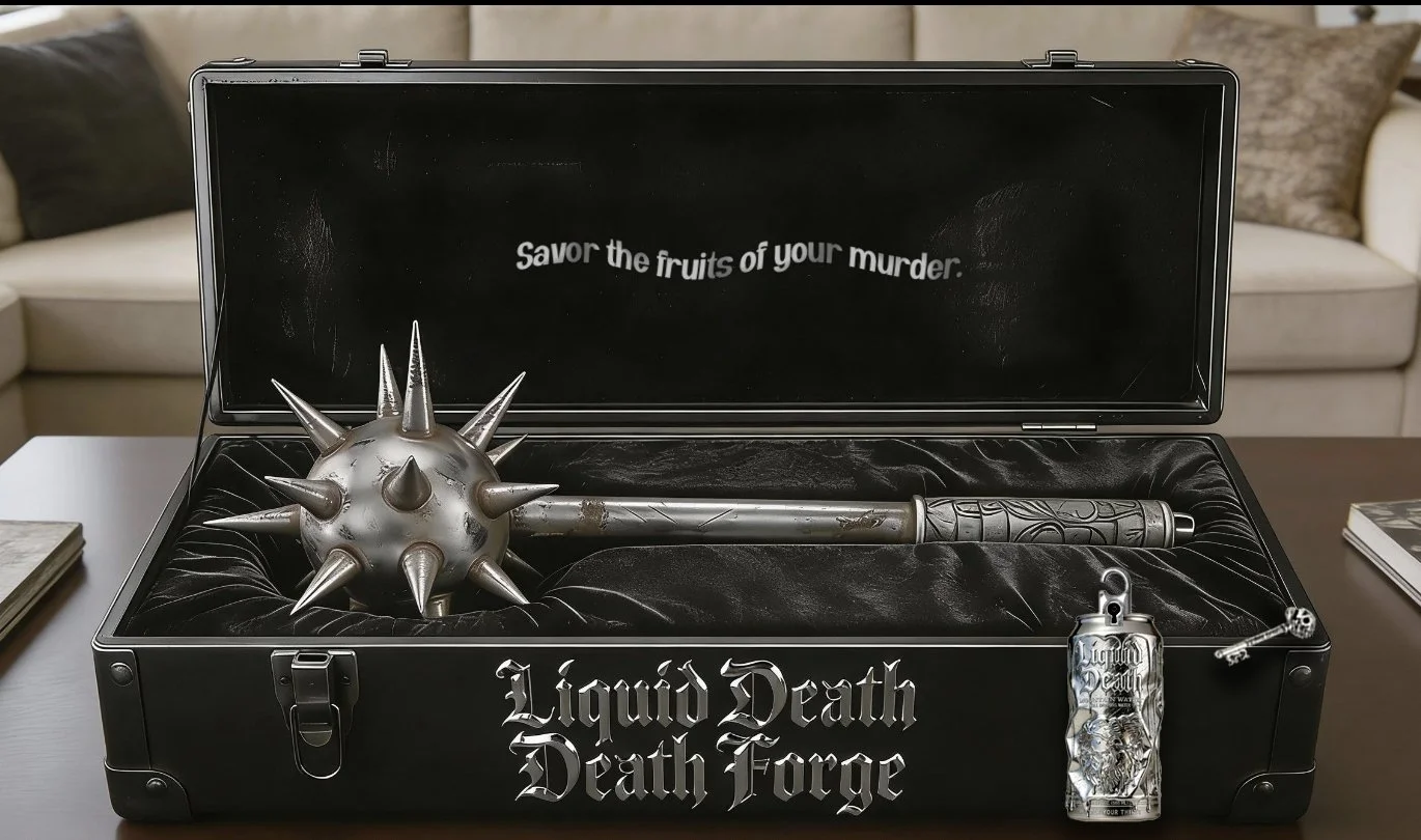 People love upcycling. That’s why Liquid Death has created the most heavy-metal form of reuse with the Death Forge. Bring us your dead, used cans and watch as reshape them into instruments and accoutrements of mass hydration.